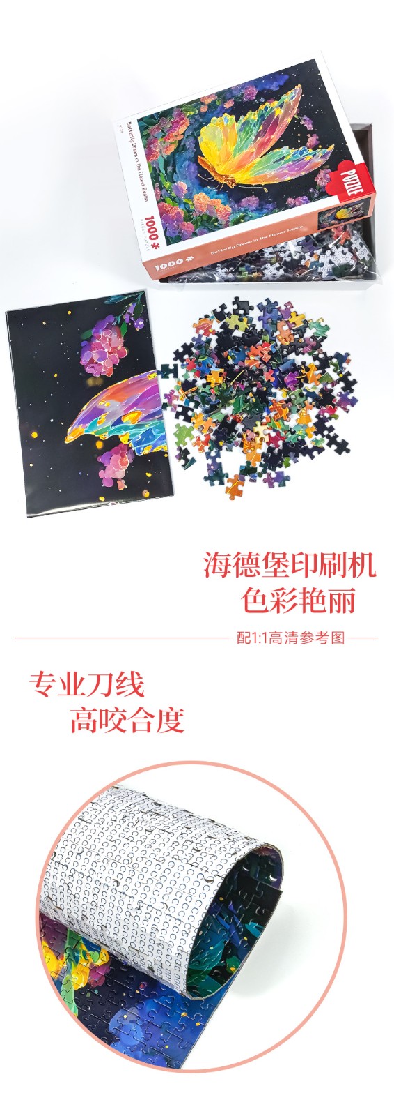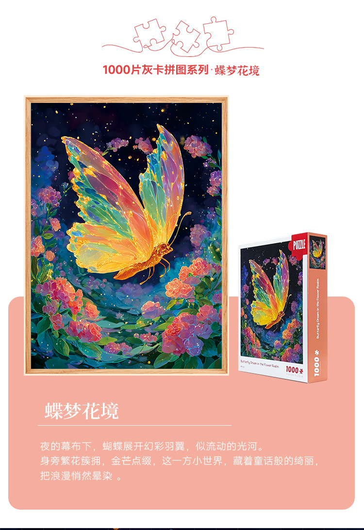 拼圖名稱:蝶夢花境-83125 拼圖尺寸:700*500MM 拼圖材質(zhì):紙質(zhì)灰卡 拼圖片數(shù):1000片 加工方式:廠規(guī)、來圖定制 包裝尺寸:180*130*50mm